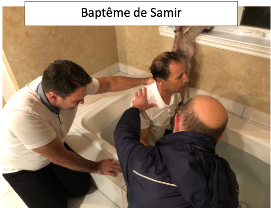 8 Aussi dans les dernières semaines nous avons eu la grâce de conduire un musulman de Tunisie au Seigneur. Ce fut une belle expérience avec les gars de l’église d’aller rencontrer Samir dans un Tim Horton et de voir les changements prendre place dans sa vie. Ce mercredi nous l’avons baptisé dans une baignoire chez José et Fernanda. Gloire à Dieu !