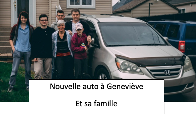 9 En septembre Geneviève, une sœur de l’église avait besoin d’une nouvelle auto. En même temps je recevais un montant de 500$ d’un de mes amis psychologues. Alors, je me suis dit démarrons une collecte de fonds pour notre sœur. Nous avons ramassé 2800$ et elle a pu s’acheter une Honda Odyssey 2006. Gloire à Dieu !